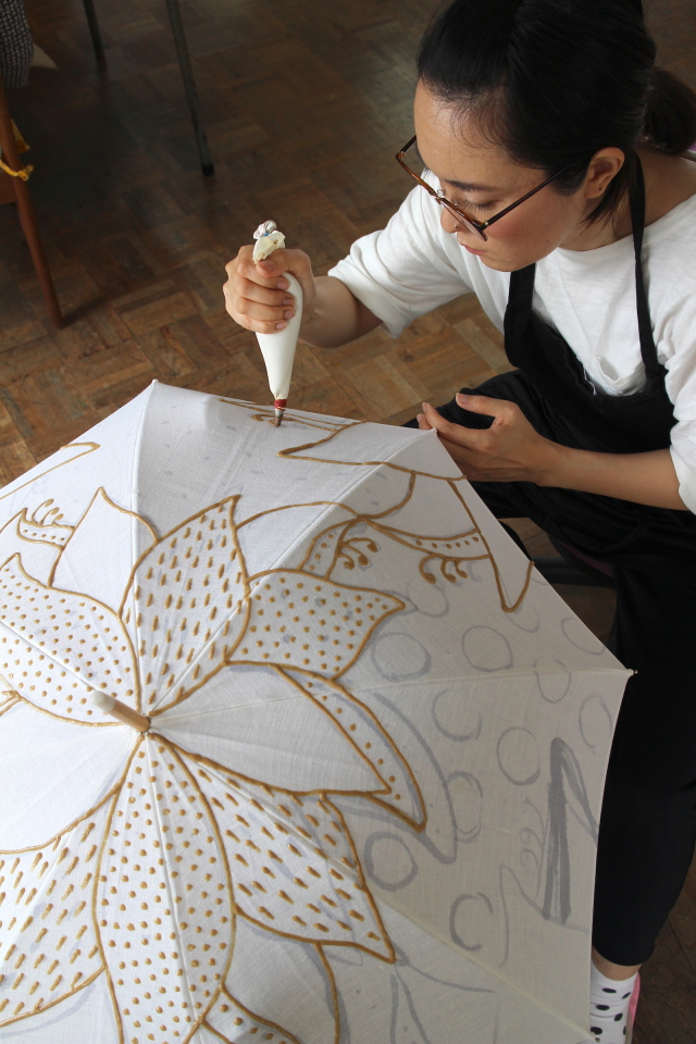 筒描きは型紙を使わず防染糊で直接布に模様を描いて色を挿していく技法です。